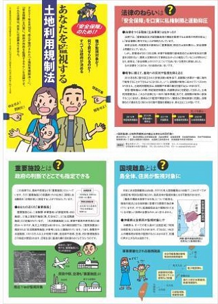 【学習リーフ「あなたを監視する土地利用規制法」今年6月の国会会期末に強行成立させられた「土地利用規制法」は、「土地」とは関係なく、すべての市民を監視対象にする危険な法律で す。施行は2022年9月とされています。この法律を発動させず、廃止させるため、ぜひご活用ください。